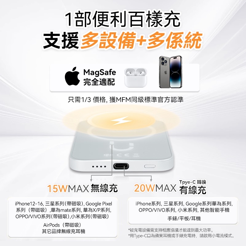 ⭐️預訂需7天⭐️ 美國USATISFY 超薄先鋒Qi2認證快充多設支援磁吸無線行動電源(MagSafe適配) 🥳超薄出行先鋒:好輕充⚡ 2025震撼上新!銀灰兩色可選! 全城首創首發!超薄8mm X Qi2 (全球最優無線充認證) 又「薄」又「Qi2」認證,Only Usatisfy🥇!15分鐘多15%電,快倍Charging,2H滿電⚡ #Apple官方認可 #Magsafe完全適配 #Andriod適配 #自動磁吸快充 ⚡如咭片大細,裸感充電,出行電量充足,不焦慮💪 ⚡可隨身登機,5000mAh大容量,隨行供電!出差/旅行✈️ ⚡超高兼容性,✔Apple/安卓/鴻蒙 ✔電話/耳機/平板/手錶(PD線)✔支援雙充快充 ⚡僅 1/3價格,獲MagSafe同級標準官方認準 ⚡3倍NTC溫控,8重安全保護機制!充過夜,都安心 ⚡選用標桿優質材料,iphone16同款面蓋玻璃,2.5D光學防爆磨砂玻璃,超靚仔果粉都大讚超Match! 🍒外壳材質:铝合金+AG玻璃 🍒配件内容:30cmType-C to Type-C线、磁吸環 🍒重量:0.13kg 🏮尺寸:106*70*8mm 🏮USB-C輸入:5V3A/9V2A 🏮USB-C輸出:5V3A/9V2.2A 🧧快充協議:PD3.0/PD2.0/QC3.0/QC2.0/AFC/FCP/SCP/SFCP/PE2.0/PE1.1 🧧無線輸出:5W/7.5W/10W/qi2-15W/MagSafe 🧧產品容量:5000mAh 19.35Wh 🧧電池種類:純鈷高密度鋰離子電芯聚合物電池(Lithium Polymer)