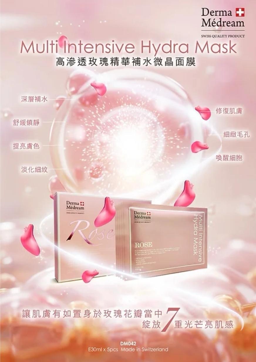 Derma Medream 高滲透玫瑰精華補水微晶面膜5片 生長在海拔高達3200米高山上的-阿爾卑斯高山玫瑰,具有鮮豔的粉紅色花朵及一年四季常綠的厚實葉子,是著名的瑞士花卉。它蘊含了特別保護作用的蛋白質成分「脫水素」,這特別的成分,使它能抵禦強烈的紫外線照射、極度乾燥及寒冷的氣候,即使環境極端惡劣,也依然能綻放出艷麗閃爍的色澤。 研究證實它能有效刺激及强化肌唐細胞的活力,同時能增強皮店的屏障功能,保護肌店對抗氣候變化而引起的各種敏感問題,具有極高的保濕及鎮靜功效,為乾性肌店持績 24 小時長效保濕,改善因乾燥造成的粗大毛孔及面部細紋,使皮唐變得柔軟有彈性。 綻放7重光芒亮肌感 1️⃣ 深層補水 💦 2️⃣ 舒緩鎮靜 3️⃣ 提亮膚色 4️⃣ 淡化細紋 5️⃣ 修復肌膚 6️⃣ 細緻毛孔 7️⃣ 喚醒細胞 使用方法: 將面膜先置於眼部位置,然後再打開敷貼全臉,輕拍將其聚貼。待15分鐘後取下,用水清洗全酸,每星期可使用一至雨次。