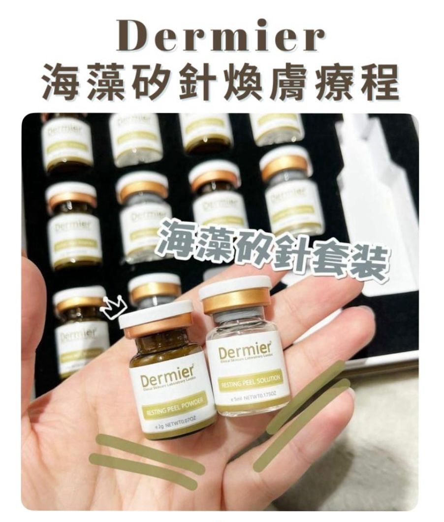 Dermier 海藻矽針煥膚療程 (1盒6次套裝) 1盒Dermier 海藻矽針6次療程 矽針粉X 6 矽針調和液 X 6 DermierB5精華 30ml 功效: 去暗瘡、去黑頭粉刺, 痤瘡, 凹凸洞、皺紋、啟動細胞修復、 收細毛孔、激退黑色素、持久保濕、淡化疤痕、膚色暗啞、 荷爾蒙斑、肝斑、妊娠紋、痘印、敏感皮膚、果酸換膚返黑、 Laser返黑、雙下巴、鬆弛、囊腫、毛囊炎、燒燙傷、疤痕創傷皮膚等 皮膚種類 : 任何皮膚 (面部, 背部, 大腿都可) 使用方法 : 第一步 : 先清潔臉部之後塗上厚厚的一層精華液 第二步 : 將海藻矽針的粉和調和液倒入玻璃碗,並充分攪拌。 第三步 : 將混合好海藻矽針輕輕的按摩的臉上(5-8分鐘),根據自己承受能力來控制按摩力度(用打圈的方法,請勿太大力度按摩皮膚,以免搓傷皮膚) 第五步 : 敷上保濕面膜,靜待15-20分鐘,撕下面膜,用清水清淨面部即可。 皮膚會微微發紅約12-24小時退紅,皮膚微刺感覺約24-38小時消失,可能會有脫皮現象,因人而異,療程後都要做好防曬與保濕,不要化妝2日。