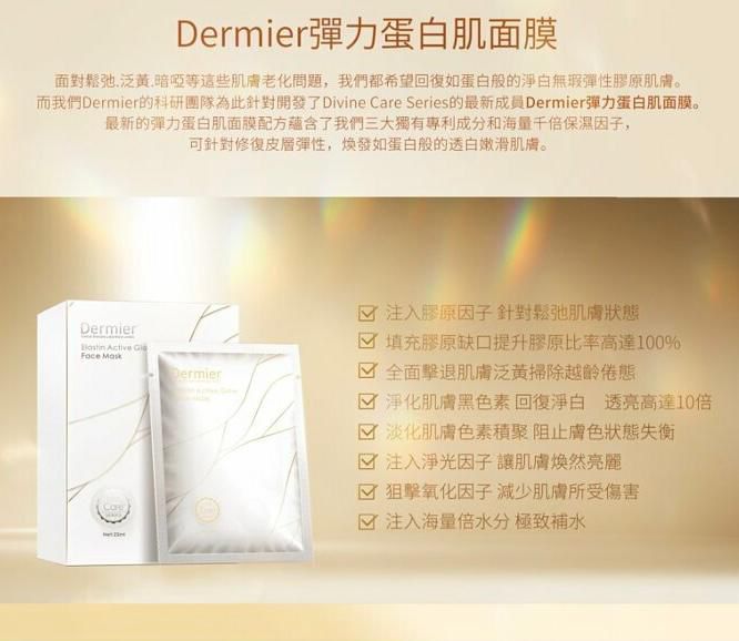 Dermier Elastin Active Glow Face Mask 彈力蛋白肌面膜6片 面對鬆弛,泛黃,暗啞等這些肌膚老化問題,我們都希望回復如蛋白般的淨白無瑕彈性膠原肌膚。而我們Dermier的科研團隊為此針對開發了Divine Care Series的最新成員,Dermier彈力蛋白肌面膜。最新的彈力蛋白肌面膜配方蘊含了我們三大獨有專利成分和海量千倍保濕因子,可針對修復皮層彈性,煥發如蛋白般的透白嫩滑肌膚。 全新的彈力蛋白肌面膜包含了Dermier獨有的Perfect White MX透澈美白配方,可以短時間內把肌膚黑色素淨化,讓皮膚如通了電的燈泡般即時淨白透亮高達10倍。配方另含針對肌膚暗啞的專利Infinity Shine因子,可以有效減淡色素積聚,防止肌膚因缺水而出現的泛黄倦態,令肌膚達致前所未有的透光淨白境界。此外產品中的Collagen Spring彈性因子可輔助皮下膠原層填充缺口,協助重組肌膚彈性,迅速提升膠原比率達100%,完美展現如初生嬰兒的水潤彈性蛋白膠原肌。 💥三大獨有專利成分💥 Perfect White MX 終極美白 Infinity Shine 全面提亮 Collagen Spring 彈力回升 產品優點 -注入膠原因子,針對鬆弛肌膚狀態 -填充膠原缺口,提升膠原比率高達100% -全面擊退肌膚泛黃,掃除越齡倦態 -淨化肌膚黑色素,回復淨白透亮高達10倍 -淡化肌膚色素積聚,阻止膚色狀態失衡 -注入淨光因子,讓肌膚煥然亮麗 狙擊氧化因子, 減少肌膚所受傷害 -注入海量1000倍水分,極致補水