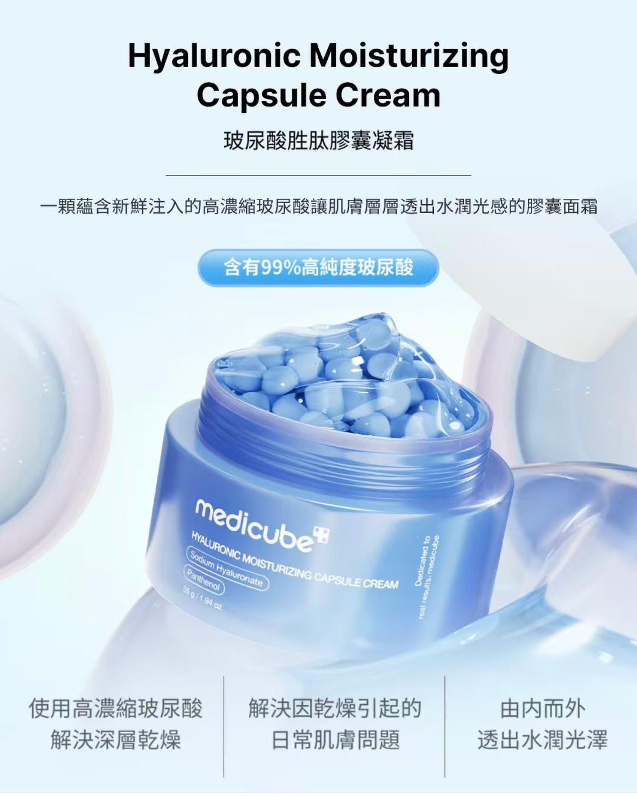 🐳Medicube Hyaluronic Capsule Cream 💙玻尿酸膠囊凝霜55g 💧一粒爆水光球,瞬間注入水晶光感 💧層層滲透水潤, 綻放晶透澎潤肌 ⭐️一顆濃縮99%高純度 ⭐️玻尿酸原液的保濕膠囊面霜 ⭐️含有99%高純度玻尿酸 ☑️低純度玻尿酸 ☑️低純度成分 ☑️殘留雜質較多 ☑️難以吸收 🤍在製作過程中,減少殘留雜質 🤍只添加99%高純度原液 🤍可提升吸收率的最高等級成分 🐳從肌膚缺水開始改善高濃縮藍色膠囊 🩵Blue capsule深層保濕補水 # 低分子玻尿酸 # 99%高純度玻尿酸 # 泛醇 5,000ppm